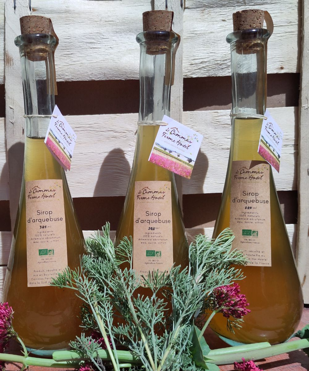 Production et transformation : L’ Arquebuse Cola (aussi appelé Artemisia abrotanum, Aurone ou Armoise Cola) est une plante vivace originaire du bassin méditerranéen. La production et la confection du sirop se font entièrement au Cammas Ferme-Hostel, dans le Sud de la France.